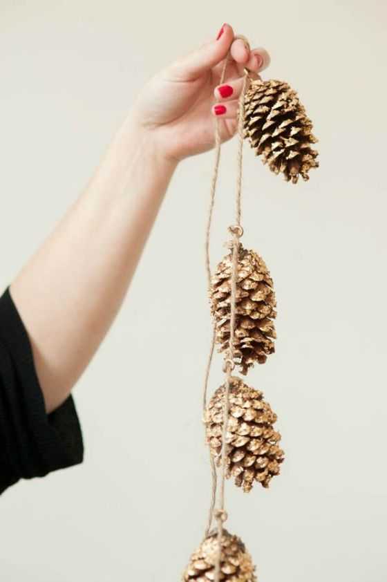 Если недалеко с домом есть лес или парк, можно набрать в нем все необходимое (шишки, хвою, сухие голые ветви, ягоды), и сделать гирлянды своими руками, дополняя их светящимися лампочками или елочными украшениями и лентами.