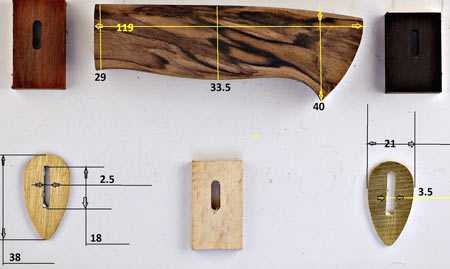 Твёрдая древесина – подходящее решение, а для ободка используют мельхиор, латунь или серебро. Штырёк заклёпки изготавливают из металла. Толщина у него должна быть 3 мм, а длина – 2,5 мм.
