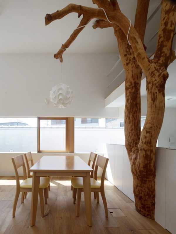 Дизайнерская стена может быть выполнена также из древесного ствола. Когда на даче высохнет дерево, его нужно спилить и заготовить из него бруски одинаковой толщины. С каждого удалить кору и отшлифовать, обработать от насекомых. Теперь можно составить композицию, взять всё: и массивный ствол и мелкие веточки. Образующиеся пустоты создадут ощущение, что картина дышит.