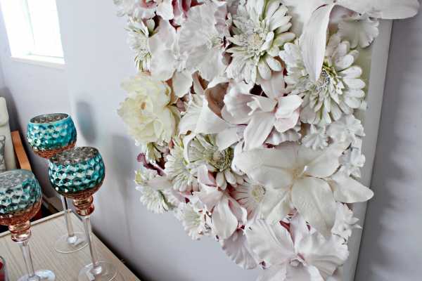 - Стену можно декорировать длинными сухими ветками в напольных вазах. Стильно смотрятся веточки, покрашенные в контрастные цвета – чёрный или белый, под золото или серебро, установленные на столик или тумбочку у кровати.