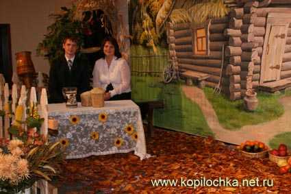 Пол на сцене устелен яркими осенними листьями — отличная идея! Слева, как вы видите, декоративный забор, перед ним выложены фрукты и овощи в корзинах. Среди украшений также живые и искусственные цветы.