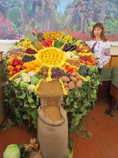 На фото — украшение на жатву в церкви г. Бердичев, Украина, 2014 год. Плоды выложены на карте Украины.