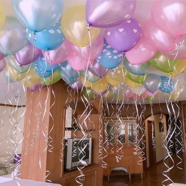 Также можно использовать шарики заполненные воздухом. Однако их придется дополнительно крепить под потолком. Из них можно создать своеобразные «облака». Для этого используйте шары разных цветов. Их можно украсить различными элементами из фольги: звездочками, кружочками или капельками.