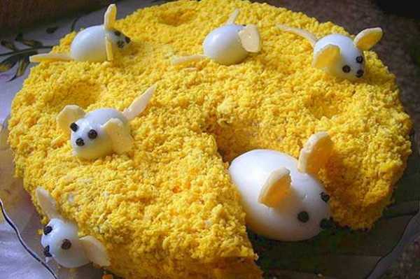 Еще одна тема мышек на салате Мимоза. Для салата понадобится отварить яйца, морковь, картофель. Затем это все нарезать и смешать с репчатым луком, сардинами в масле, зеленью и майонезом. Мышек сделать проще простого: из вареных яиц, кусочком сыра, перца горошком.