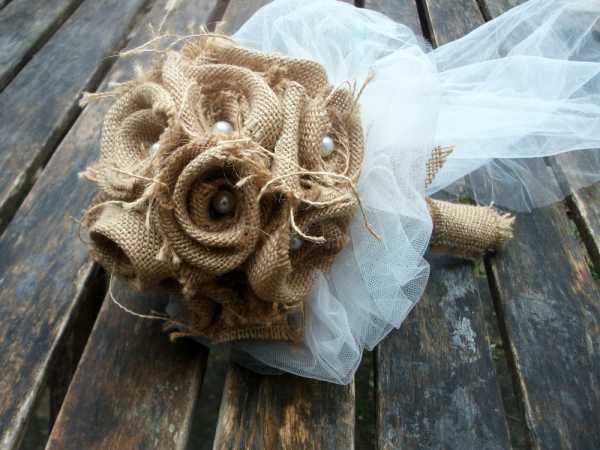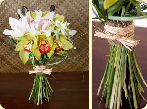 При декорировании букетов джутом, на фоне его структурной грубости особенно проявляется природная нежность живых растений. Джутовая сетка может быть прекрасным элементом оформления букета из экзотических цветов: орхидей, протей и стрелиций.