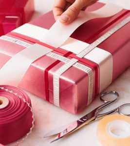 подарок в упаковочной бумагеЧтобы упаковать подарок аккуратно следует точно отрезать кусок бумаги, который полностью обернет вещь.