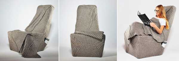 Польский дизайнер Aga Brzostek, например, прославилась тем, что догадалась объединит две неразрывно связанные вещи – вязаный плед и кресло. Теперь не нужно искать покрывало по всему дому, оно всегда там, где должно быть! Твердый каркас кресла покрыт мягким материалом, а вязаный чехол можно снимать, чтобы почистить.