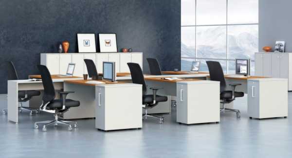 Для нормальной работы нужен стол с изоляцией, вместительная тумба для бумаг и личных вещей, а также удобное компьютерное кресло, желательно на колесиках. Количество шкафных модулей зависит от числа работников и специфики компании. Важно разместить всю мебель так, чтобы к ней был свободный доступ. Для организации зоны отдыха рекомендуем использовать мягкий уголок и/или кресла.