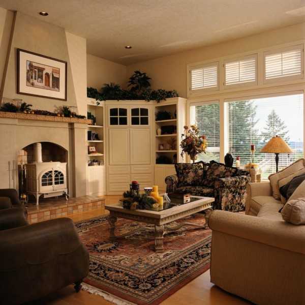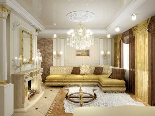 В гостиной, по мере возможности, возможно установить камин. Уместна классика в том случае, если по душе владельцам дома красота.