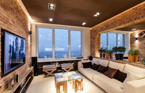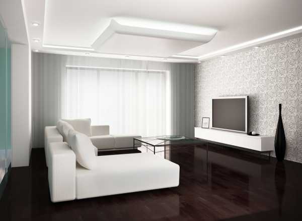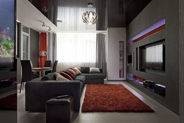 Потолок в гостиной должен оставаться светлым, чтобы не создавать ощущение сдавленного пространства. Часто потолок делают натяжной, глянцевой или матовой фактуры.