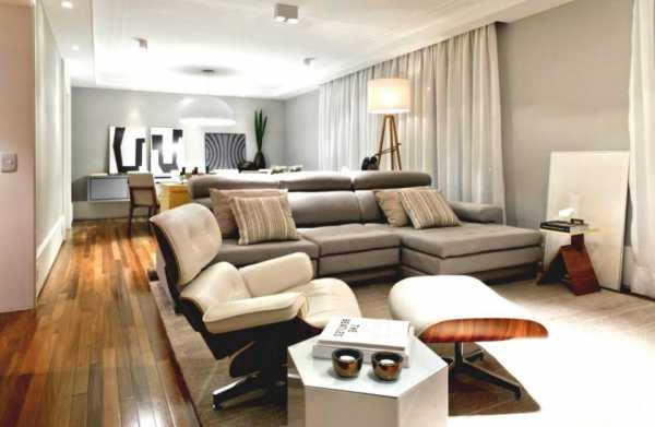 Пол в гостиной может быть различных оттенков, как светлых так темных, особую роль в организации пространства он не играет.