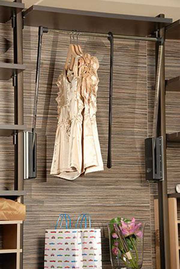 Вешало-лифт прекрасно впишется в интерьер маленькой гардеробной, увеличив площадь хранения постоянно используемых предметов одежды