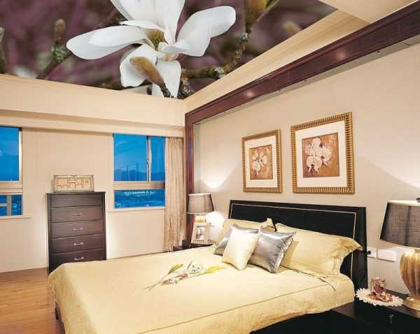 Потолок, только белого цвета и с высококачественной отделкой сделает спальню выше и наряднее.