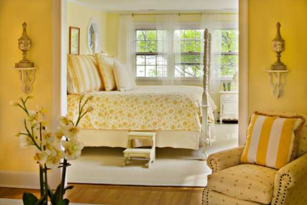Желтые тона отражают свет, лучше использовать их в плохо освещенных спальнях.