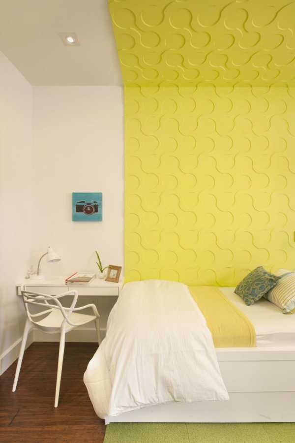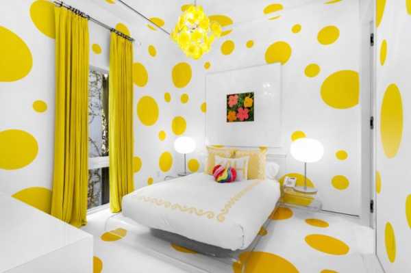 Можно наклеить однотонные желтые обои в спальне светлых тонов или с мелким рисунком.