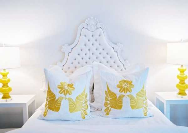 Не надо бояться смелых идей, у каждого цвета масса возможностей. Спальня в белом варианте и желтыми аксессуарами дает праздничность и элегантность.