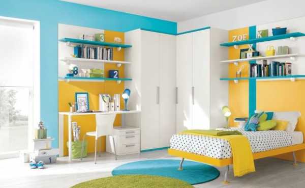 Довольно нежно и свежо смотрится комбинации желтого и голубого, если желтый цвет выступает в качестве основного фона, а голубой находит свое применение в покрывалах, подушечках и шторах.
