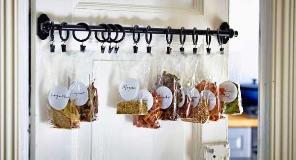 - Если вы — категоричный противник баночек, вам просто лень этим заниматься, у вас нет денег на емкости или же приправы уходят так быстро, что выдохнуться в пакетиках не успевают, для вас есть другой креативный вариант: размещаем пакетики на веревочках с красивыми мини-прищепками (сегодня в продаже есть весьма оригинальные дизайнерские прищепки, которые умелые хозяйки используют даже для развешивания семейных фотографий).