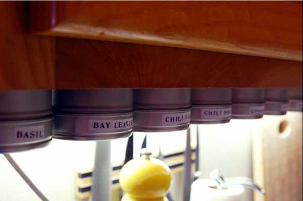 Еще одним оригинальным решением может стать расположение приправ под навесными шкафчиками. Технически это осуществляется 3 способами: к нижней поверхности навесного шкафа крепятся магнитные рейки для металлических контейнеров или крышек, металлический лист для магнитных баночек или обычные поворотные крышки для вкручивания в них баночек с приправами (например, от детского питания). Очень важно подобрать красивые одинаковые баночки, чтобы это оригинальное решение не выглядело дешево и неаккуратно.