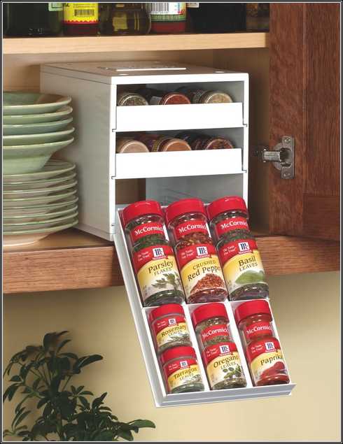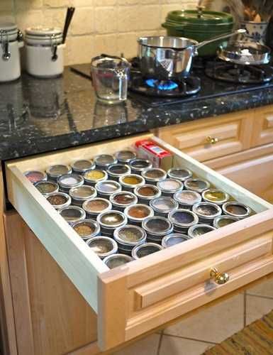 • В выдвижном ящичке. Это идеальное место для специй, ведь в ящик не проникает солнечный свет. Кроме того, из ящика удобно доставать необходимые приправы.