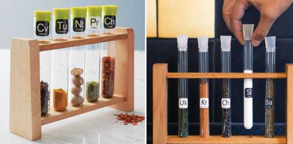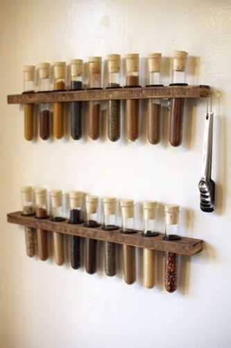 Нестандартный способ хранения пряностей – пробирки. Такой вариант подойдет для специй в малых количествах. Сыпать приправы из пробирок тоже удобно (не забудьте закрывать емкость пробкой).