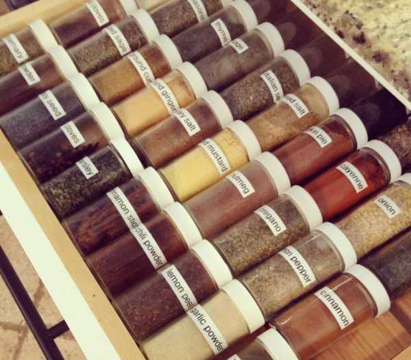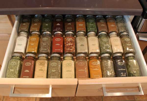 Идеально подходят для хранения выдвижные ящики. Они помогают держать специи под рукой и в то же время скрывать их, когда такой необходимости нет. Этикетки размещаются на крышечках, если емкости располагаются в вертикальном положении или на боковых частях, если они находятся под наклоном.