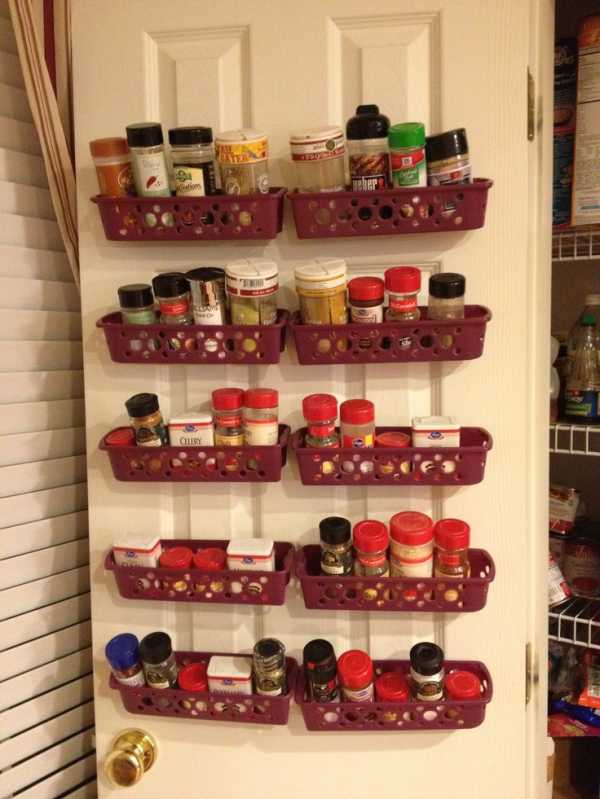 Хранение в органайзере с прозрачными кармашками на дверце внутри шкафа подходит для приправ в оригинальных пакетиках. Минус такого способа заключается в том, что если в один кармашек положить несколько разных приправ, они будут закрывать друг друга, и придется тратить больше времени на поиски.