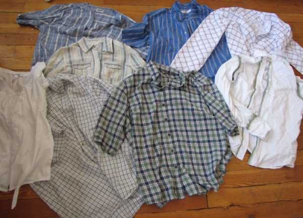 Итак, для работы подойдет давно лежащая в шкафу, но никому ненужная рубашка мужа. Самая обычная классическая рубаха с длинным подолом и воротничком. Если с клеточной моделью не повезло, то подойдут такие цвета как: