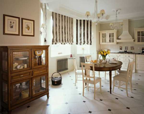 Стилизованная бытовая техника, богато декорированный гарнитур с буфетом, уставленным подходящей посудой, изящные смесители бронзового цвета найдут свое место в интерьере кухни.
