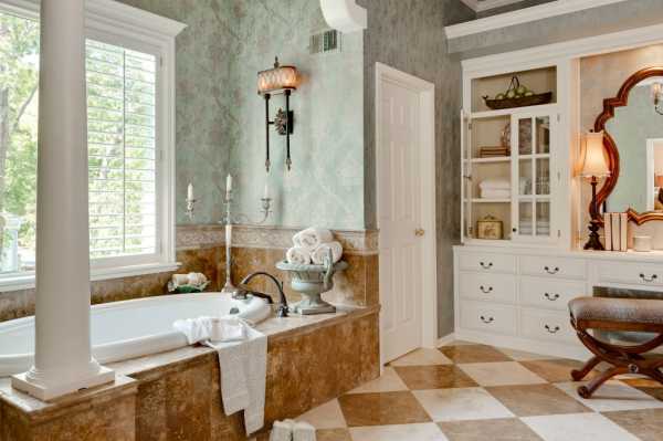 Кто сказал, что ванная комната должна быть непременно отделана кафелем? В 2016 году санузлы часто декорированы не хуже жилых пространств. Если для вас принятие ванны — это настоящий ритуал, то почему бы вместо санузла не устроить изящный будуар? Стиль винтаж с его вниманием к деталям поможет блестяще справиться с этой задачей. Винтажная ванна на ножках, которую вы, наверняка, видели в европейских фильмах, повествующих о 40–60-х годах, тумба под раковину, снабженная многочисленными ящичками для хранения мелочей, зеркало в золотистом багете — и вот интерьер будуара уже почти готов. Для большего сходства с интерьерами середины прошлого столетия пол можно покрыть кафелем, в раскладке которого чередуются черные и белые многогранники. В отделке стен сочетаются белые деревянные панели и обои с цветочным узором. Такое оформление максимально сближает санузел с жилыми комнатами. Пышный яркий букет в вазе «поддерживает» цветочные мотивы, заданные обоями оттенка капучино.