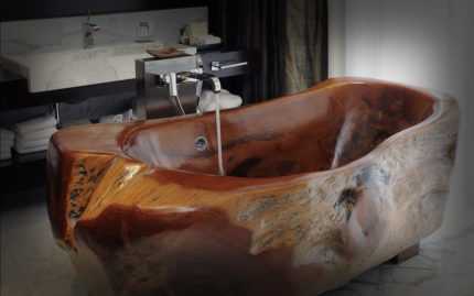 ![]() Каменная ванна | Элитные модели современного дизайна. Самые востребованные варианты – из природного и литьевого мрамора. Отличаются устойчивостью, роскошным внешним видом, стойкостью к нагрузкам. Материал обладает низкой теплопроводностью, легко очищается, поддается реставрации, долговечен | Высокая цена, большой вес изделий, особенно из натурального камня, подверженность сколам и царапинам. Материал может впитывать цветные жидкости и покрываться пятнами, разрушается при контакте с кислотными очистителями |