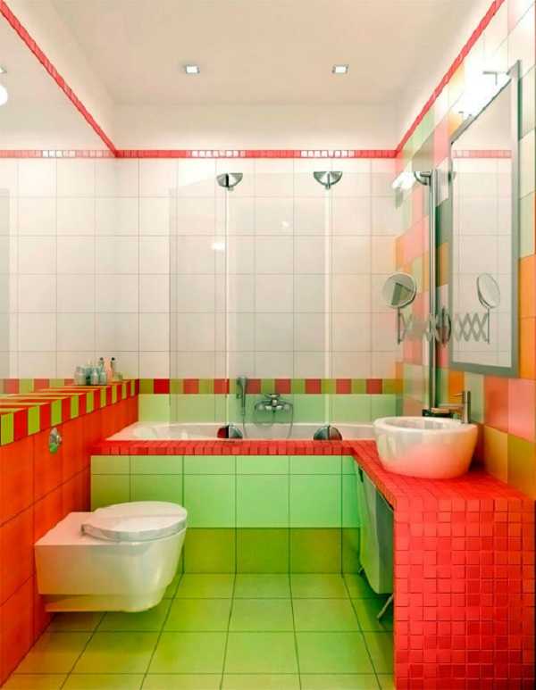 Красиво смотрится мозаика свежих тонов и на стенах, и на бортиках, удачно разделяемая белыми оттенками.