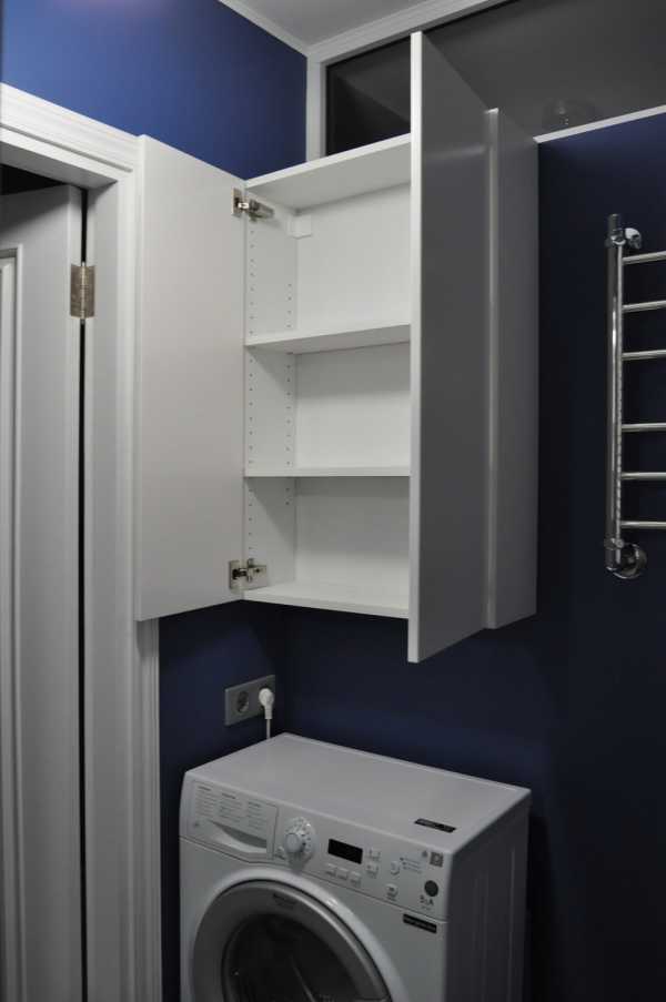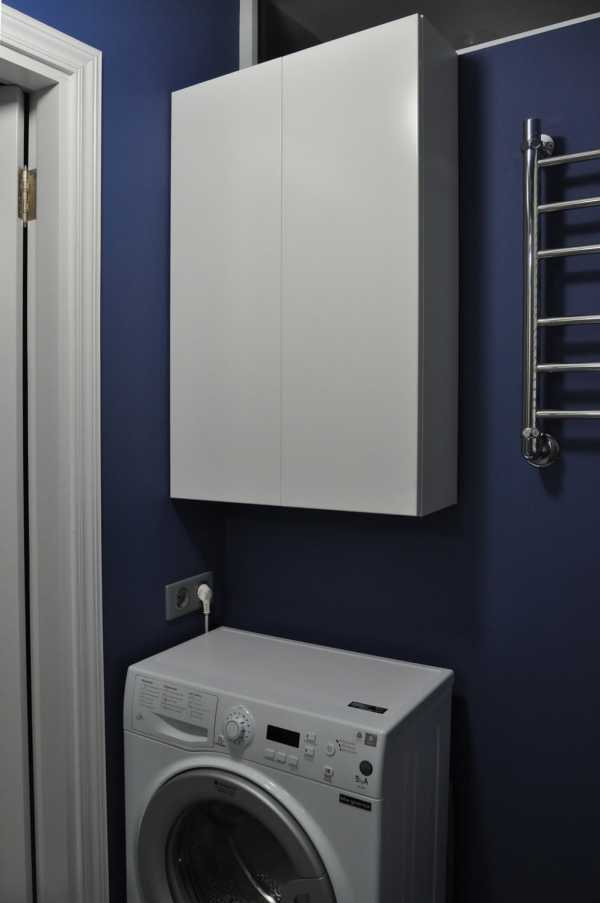 Так, над стиральной машинкой подвесили шкаф для хранения запаса бытовой химии. Его купили в ИКЕА, и подогнали по конкретным размерам: глубину уменьшили на 17 см.
