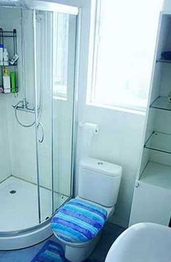 - Минимализм в отделке малогабаритных ванных комнат с душевыми кабинами – вот оптимальный вариант при выборе стиля. Здесь главное не переборщить – следует предусмотреть места для хранения бытовой химии, стиральных порошков, зубной пасты, туалетной бумаги и прочих ванных принадлежностей. Шкафчики или полки можно расположить по сторонам душевой кабинки, предусмотрев необходимые разрывы между оборудованием.