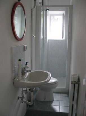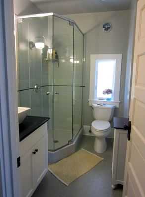 Фото 8. Узкую ванную комнату увенчивает душевая дверь с размещенным за ней крохотным, но вполне достаточным для принятия душа пространством. Небольшое окошко, открывая путь солнечным лучам, визуально увеличивает помещение.