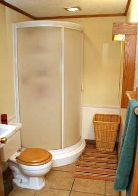 Фото 9. Подчеркнуто «деревенский» уютный интерьер в мягких коричнево-бежевых тонах слегка напоминает обычную комнату, однако наличие душевого уголка с матовыми стенками (70×90) в углу и сантехнических изделий указывает на то, что перед нами маленькая ванная комната. Белоснежный контур душевого уголка немного диссонирует с деревянной отделкой комнаты, но, тем не менее, он выглядит здесь весьма уместно.