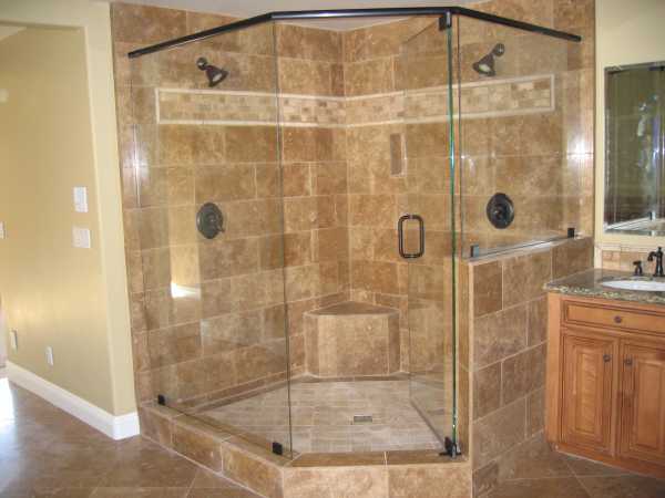 Что может быть проще и универсальней? Угловая душевая может быть создана в ванной любого размера и стиля, причем она сэкономит вам много места, времени и сил. Можно обойтись простым металлическим поддоном и округлыми раздвижными ограждениями, а можно пойти дальше и создать шикарный угловой душ для двоих, как на следующем фото.