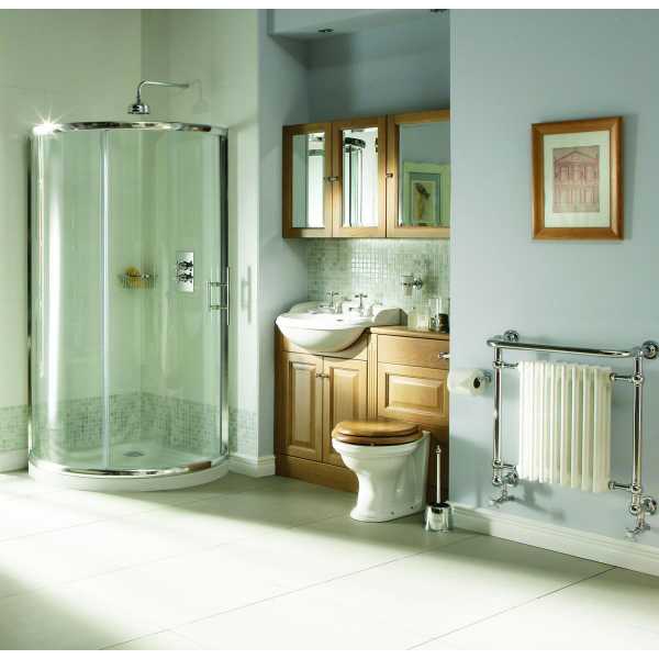 Фото 6. В уютной небольшой ванной комнате нашлось место для каждого предмета интерьера. Полукруглый душевой уголок без поддона (800×800×1950), расположенный в углу помещения, привлекает взгляд серебристыми контурами обрамления, служащего не только креплением его фасада, но и элементом украшения комнаты.