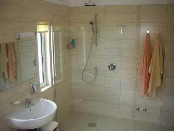 - Если дверь в ванной комнате «сдвинута» от центра в сторону, то душевые гармоничнее всего будут смотреться в дальних углах или вдоль дальней стены.
