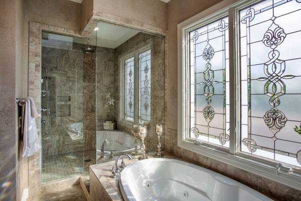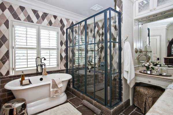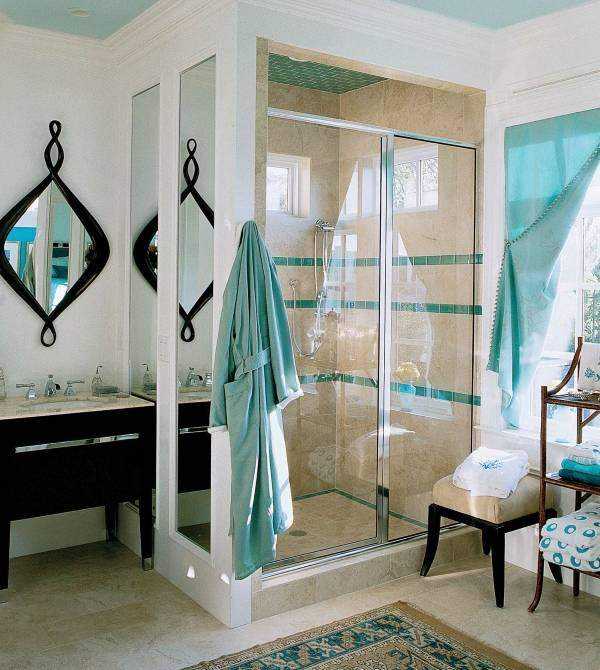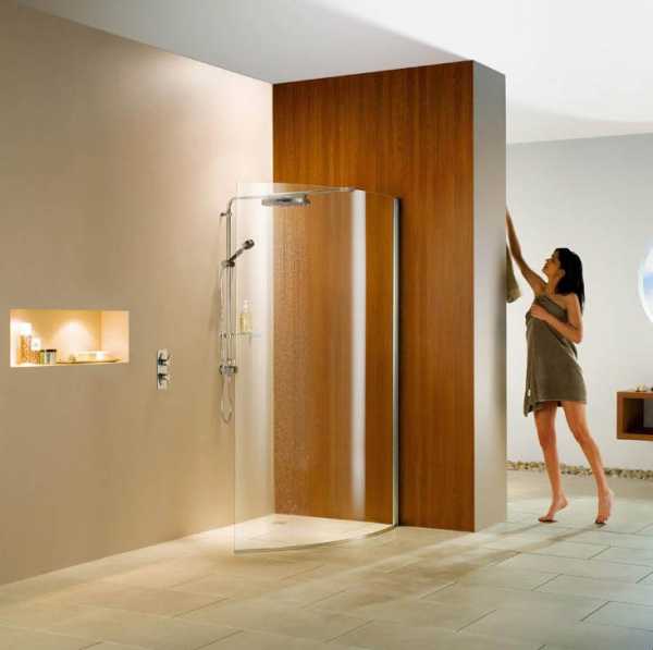 Очень интересно и уютно выглядят душевые, расположенные в нише или отделенные от ванной частью стены. Стеклянные двери и ограждения призваны сохранять внутри них тепло и защищать остальную часть комнаты от влаги.