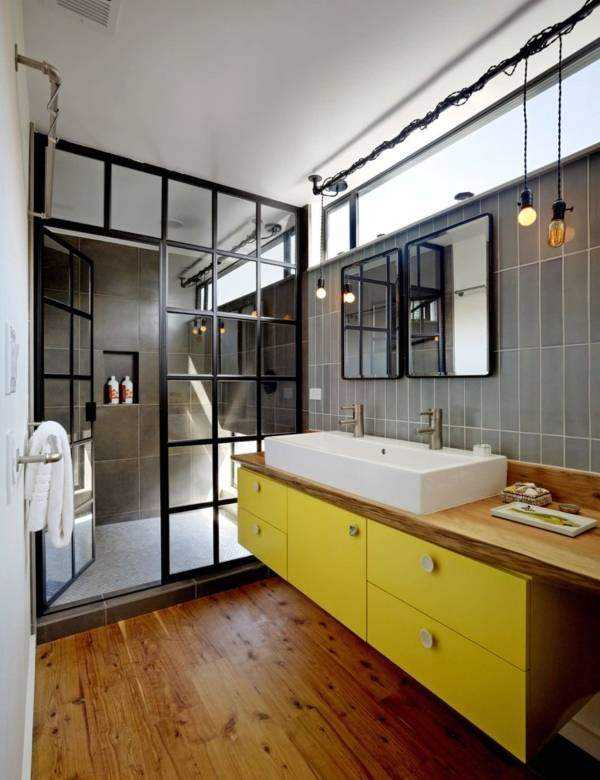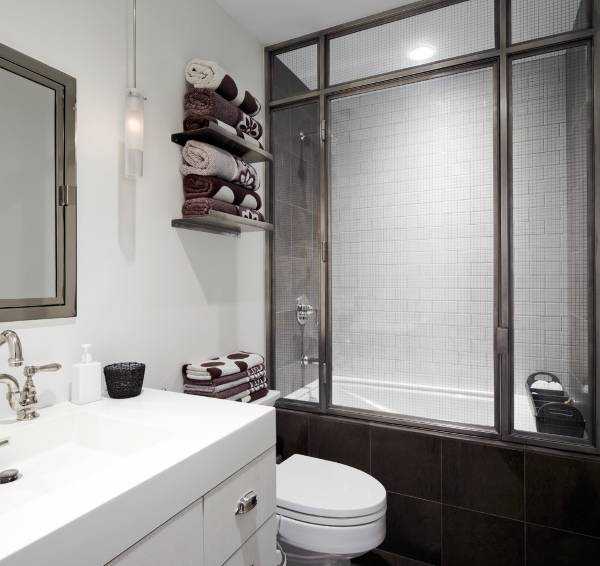 Дверцы из матового, орнаментированного, фактурного или цветного стекла, отделка контрастным кафелем, вмонтированный в пол слив, деревянные напольные решетки – штрихи современного урбанизированного жилища найдут отклик в душах того, кто любит стильные детали.