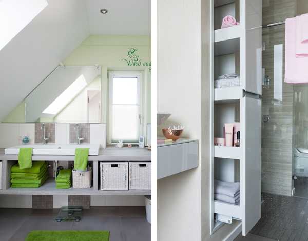 Хранить белье в стиральной машинке до стирки — не выход. Но от корзины в ванной лучше избавиться — переместить в кладовую или другое помещение. Основная задача — сделать так, чтобы бельевая корзина не выделялась на общем фоне. Если убрать ее совсем некуда — спрячьте этот «предмет интерьера» с глаз долой, во встроенный шкаф. Точно так же можно поступить со стиральной машинкой, если механизм загрузки не верхний, а фронтальный. Этим вы решите сразу две проблемы: вечно оставленные на машинке вещи не будут притягивать взгляд, а сама машинка органично впишется как нижний элемент шкафа до потолка.