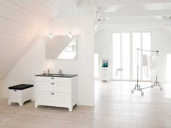 При выборе мебели для ванной в скандинавском стиле останавливаются на максимально функциональных экземплярах. Предпочтение отдают простым и компактным моделям. Причем их не должно быть много, чтобы оставалось достаточно свободного пространства для передвижения. Скандинавский стиль в ванной и теснота – понятия несовместимые. Минимальный комплект включает в себя предметы, предназначенные для хранения банных принадлежностей. Большая площадь позволяет немного расширить набор, который может содержать: