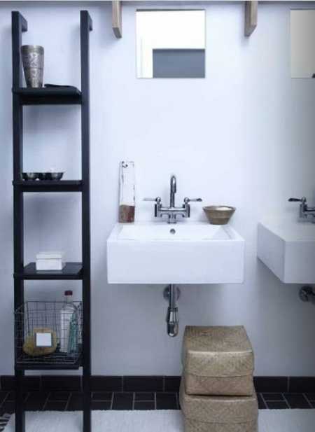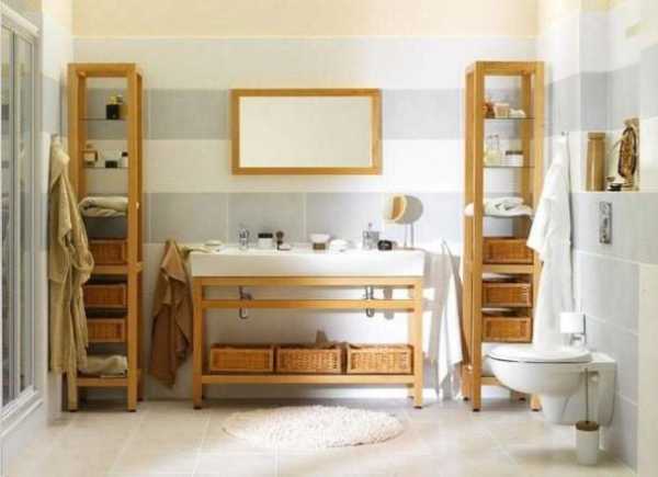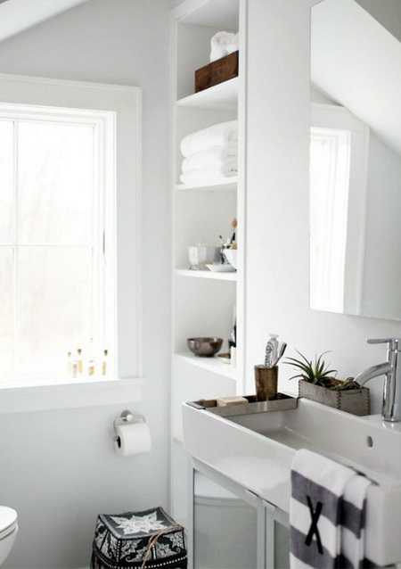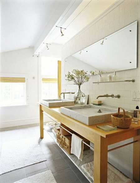 все имеющиеся горизонтальные и вертикальные поверхности. Сливочные оттенки дерева добавят тепла в прохладную цветовую основу.Обязательно присутствие деревянной мебели и предметов декора из натуральных материалов. Это могут быть деревянные стулья, шкафчики, вешалки, полочки, плетеные корзины для белья или глиняные подсвечники.