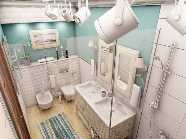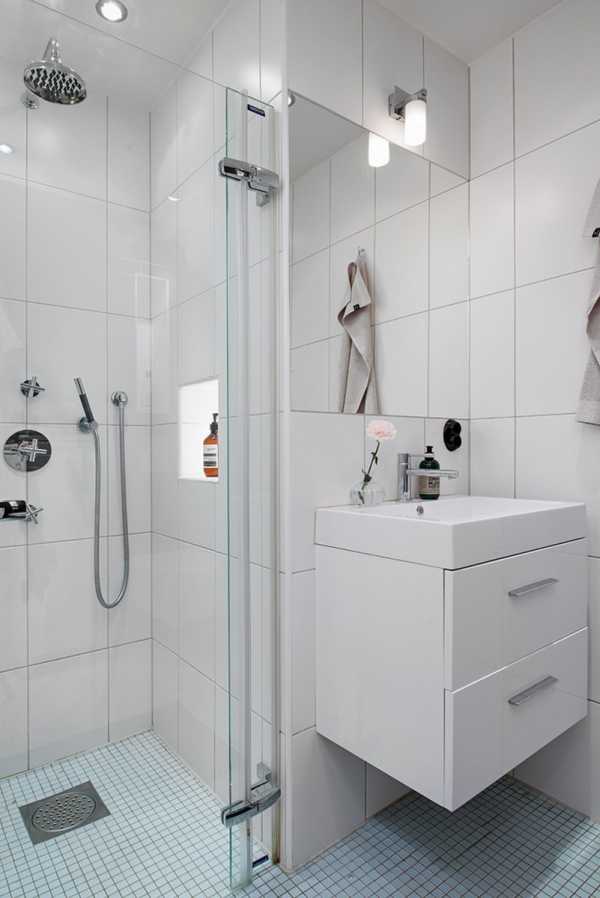 стекла и зеркал для увеличения освещенности комнаты. Это могут быть стеклянные полочки, стенки и дверцы душевой кабины, зеркальные дверцы шкафчиков и просто зеркала на стенах.