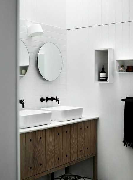 Использование черно-белой графики – излюбленный прием дизайнеров, специализирующихся на скандинавском стиле. Особенно эффектно она смотрится на фоне более теплых элементов дизайна, таких как светлая древесина и латунные смесители. Дизайнеры из Auhaus Architecture сделали довольно смелый, но, в конечном счете, правильный выбор напольного покрытия с черно-белым геометрическим рисунком, в результате подарив хозяевам этого современного дома в Мельбурне очень сложный, фактурный и, главное, уникальной вид ванной комнаты.