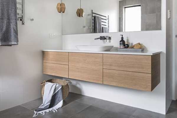 Мебельный набор для ванной комнаты может включать в себя только самые необходимые предметы, которые иногда ограничиваются местами хранения. К ним относятся настенные или напольные шкафчики, которые устанавливаются под раковину. Нередко встречаются встроенные конструкции. Для банных халатов и полотенец рекомендуется приобрести подвесные крючки, а также стремянки.
