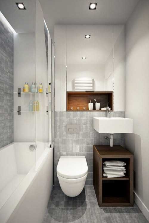 Так, одним из приёмов можно назвать использование в помещении ванной минимального числа предметов мебели. Мебель и оборудование могут комбинироваться, например, умывальник здесь можно повесить над ванной, а стенной навесной шкаф разместить над полотенцесушителем. В обязательном порядке в помещении нужно будет размещать зеркала и блестящие поверхности, использовать при оформлении светлые тона.