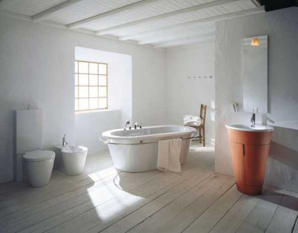 Что касается самой ванны, то она должна быть овальной формы и белого цвета. Обычно её размещают на деревянном подиуме. Когда это невозможно сделать, используется имитация дерева. Такой дизайнерский ход даёт возможность подчеркнуть минималистический характер данного варианта дизайна интерьера помещений.