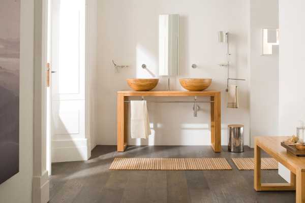 Ванная в скандинавском стиле должна оформляться исключительно с использованием влагостойких материалов. Это могут быть и доски, выполненные из дерева экзотической породы, но их дополнительно защищают специальной масляной пропиткой.
